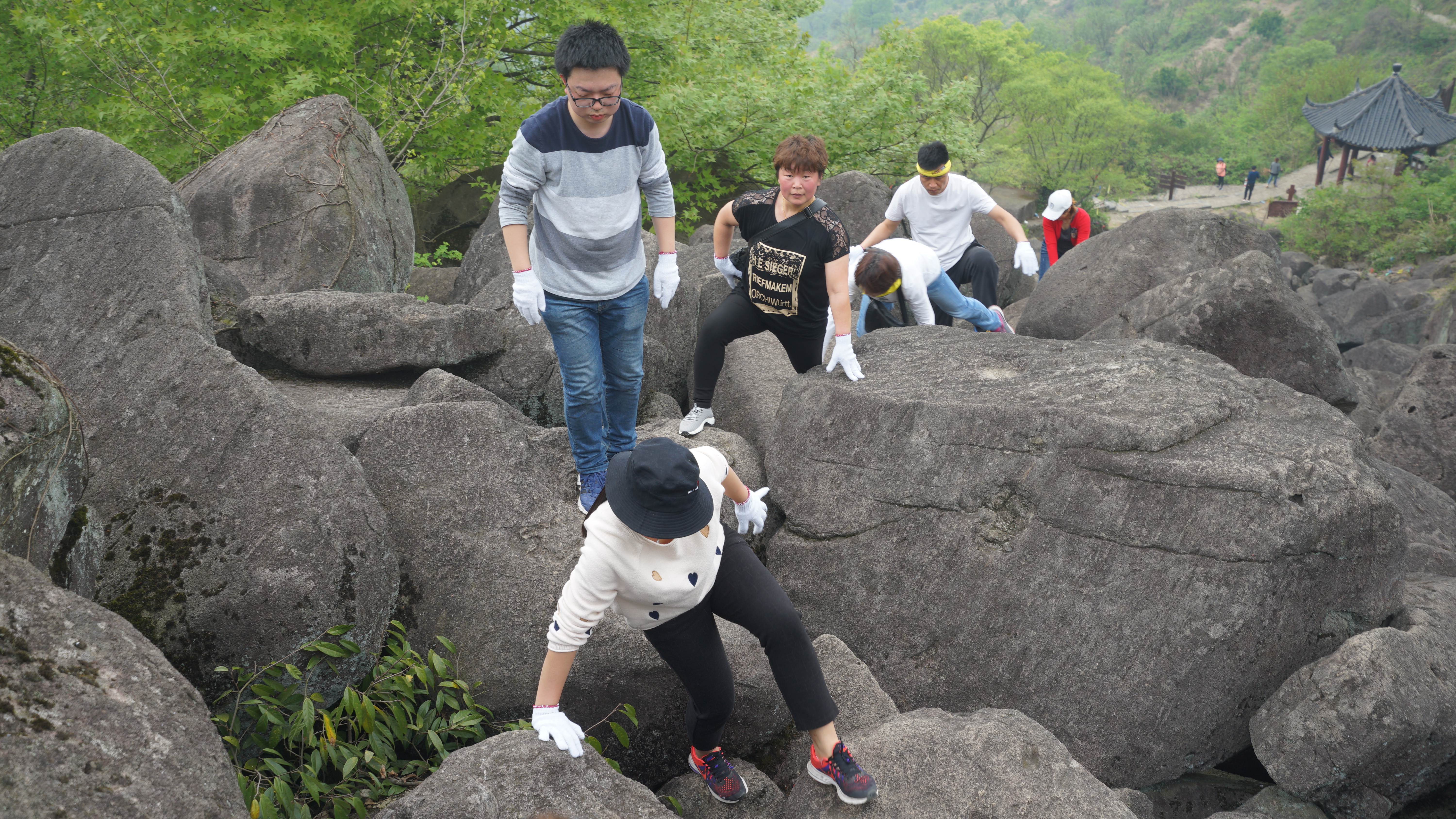 行程的最后一天,大家來到四明山支脈——覆卮山,挑戰攀爬冰川石浪。石堆壘積,似涌浪滔天,石浪因此得名。一步一步,小伙伴們跨過近半山,集合在冰川石浪的起點。抬頭朝終點望去,遙遙無盡,好似通天。在大自然的杰作面前,人類顯得無比渺小,但即使如此,人都有一股不服輸的勁兒。帶上防滑的布手套,小伙伴們迫不及待跨出了第一步。在攀爬過程中,大家充分展現不屈的團隊精神,手腳并用、相互扶持、加油鼓勁,一點一點地向上挪動,最終成功感受了一把“會當凌絕頂,一覽眾山小”的暢快。